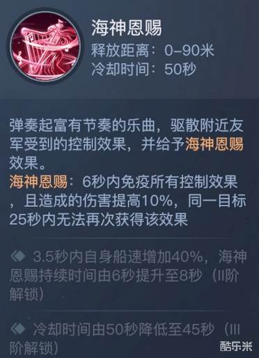 该专精中的值得升阶的是4技能海神恩赐,升阶后能提升自身船只移动速度、增加Buff持续时间和减速技能冷却,是PVP技能中辅助神技,但是这个技能的升阶花费比较大。