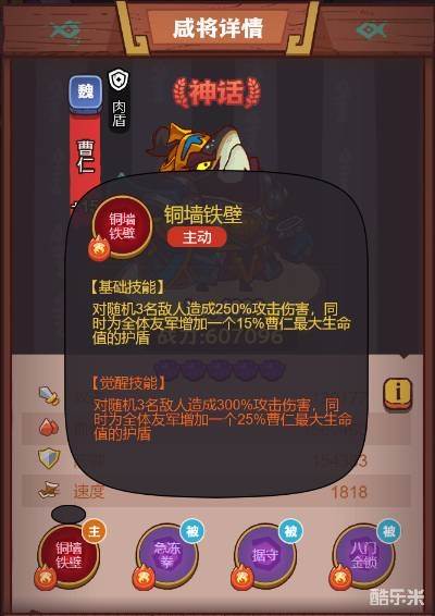 曹仁:血量550亿,大招铜墙铁壁,释放技能的效果是对随机3名敌人造成250%攻击伤害,同时为全体友军增加一个15%曹仁最天生命值的护盾。