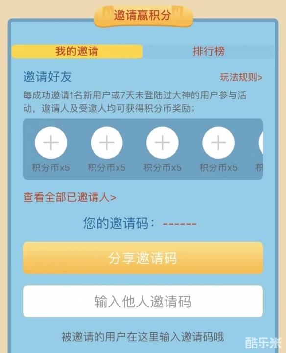 看到了抽奖池中的丰厚好礼,想必诸位幸存者们早已想马上完成任务,获得积分币参与抽奖了吧!别着急!再悄悄告诉你一个如何获得抽奖币的小秘密吧!邀请好友参与活动,每成功邀请1名新用户或7天未登陆过大神的用户参与活动,邀请人及受邀人均可额外获得积分币奖励哦!心动不如行动,快邀请小伙伴一起参与活动,赢积分币兑换丰厚好礼吧!