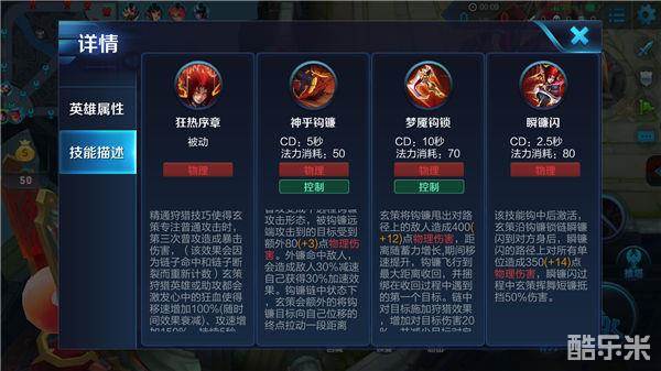 一技能,神乎钩镰:钩镰链中状态下,百里玄策会额外的将钩镰目标向自己位移的终点拉动一段距离。该技能位移可以越过地形,短技能CD赋予百里玄策高机动性,在与敌人交战时可以运用三下普攻后的远程攻击风筝敌人。