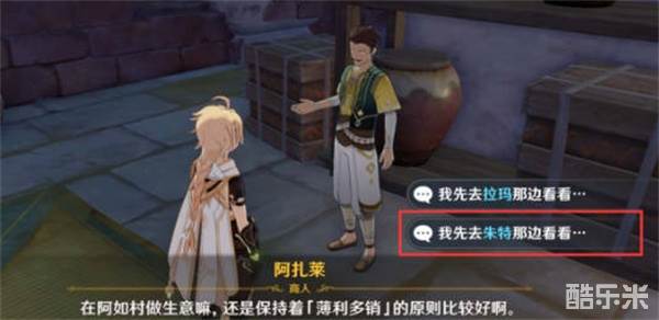 1:我们首先到须弥阿如村这里找到阿扎莱进行对话,我们可以知道店铺的货物不够了,我们需要帮助他外出订货并且寻找到固定的伙伴;