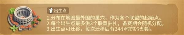 由于中立巢穴得首占能获得钻石,并且一共有20个出生点,因此尽量自己联盟独占一个出生点,若是其他联盟直接过来我方的出生点,那证明对方很大可能是想合理我方抢夺资源,若是沟通无效后则需要在开赛期一开始就组织好人员发起首占进攻,因为有短暂的护盾因此不怕被敌方联盟的成员抢夺。