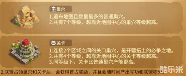 蚁王之战主要是25个联盟之间的攻城战,每个联盟尽可能的获取更多的巢穴,以此获得更多的积分,最终会以积分的多少对每个联盟进行排名,并按照排名发放大量奖励,最后按照排名和活跃度计算蚁王段位的加减分。