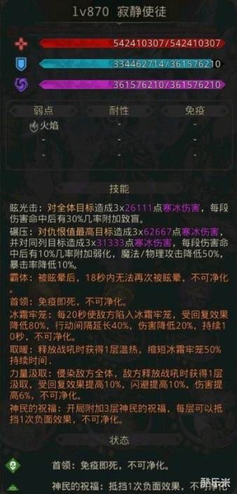 6.启迪殿堂,副本为两部分,第一部分BOSS为静寂使徒,而且在我们见BOSS时身上会有降低30%命中率debuff,所以记得带上麻痹戒指,双C带上净化腰带或者奶带永望,净化自己的致盲效果,BOSS并不强力。