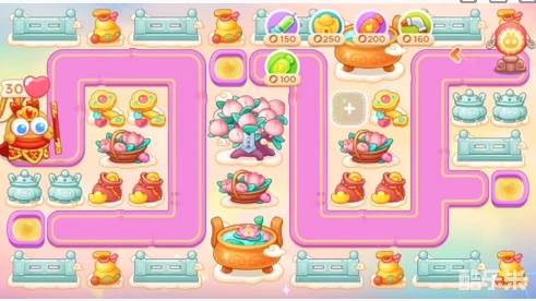 1、本关能够使用的炮塔是:毒针、元宝、火瓶、回旋镖、普通炮,这一关我们比较好用的输出是回旋镖。