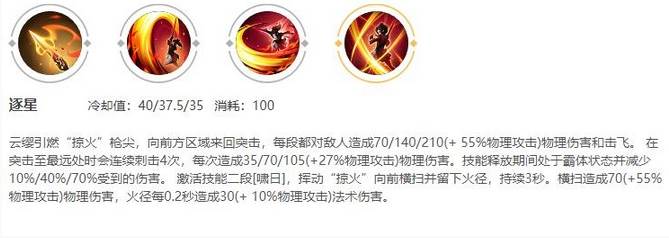 云缨引燃“掠火”枪尖,向前方区域来回突击,每段都对敌人造成70/140/210(+ 55%物理攻击)物理伤害和击飞。