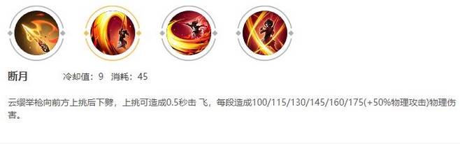 云缨举枪向前方上挑后下劈,上挑可造成0.5秒击 飞,每段造成100/115/130/145/160/175(+50%物理攻击)物理伤害。