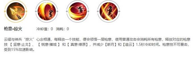 云缨与神兵“掠火”心念相通,每释放一个技能,便会领悟一层枪意,使用普通攻击会消耗所有枪意,释放对应的枪意技 【 坚意·止戈】、 【 锐意·摧城 】 和【 真意·燎原】,并减少【断月】和【追云】1.5秒冷却时间。枪意技不可暴击,受到15%攻速影响。