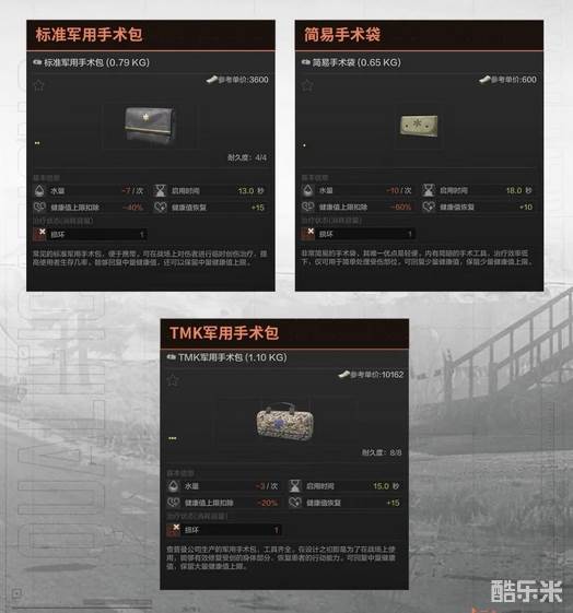 手术包目前有4种,它们分别是简易手术袋、标准军用手术包和TMK军用手术包,分别占背包1格、2格和3格。
