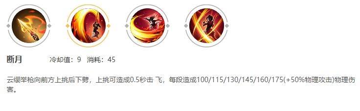 云缨举枪向前方上挑后下劈,上挑可造成0.5秒击 飞,每段造成100/115/130/145/160/175(+50%物理攻击)物理伤害。