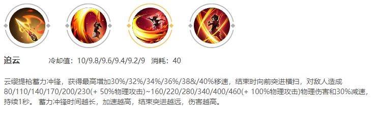 云缨提枪蓄力冲锋,获得最高增加30%/32%/34%/36%/38&/40%移速,结束时向前突进横扫,对敌人造成80/110/140/170/200/230(+ 50%物理攻击)~160/220/280/340/400/460(+ 100%物理攻击)物理伤害和30%减速,持续1秒。 蓄力冲锋时间越长,加速越高,结束突进越远,伤害越高。