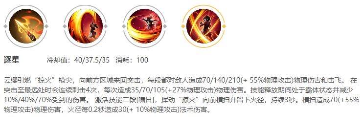 云缨引燃“掠火”枪尖,向前方区域来回突击,每段都对敌人造成70/140/210(+ 55%物理攻击)物理伤害和击飞。 在突击至最远处时会连续刺击4次,每次造成35/70/105(+27%物理攻击)物理伤害。技能释放期间处于霸体状态并减少10%/40%/70%受到的伤害。 激活技能二段[啸日],挥动“掠火”向前横扫并留下火径,持续3秒。横扫造成70(+55%物理攻击)物理伤害,火径每0.2秒造成30(+ 10%物理攻击)法术伤害。