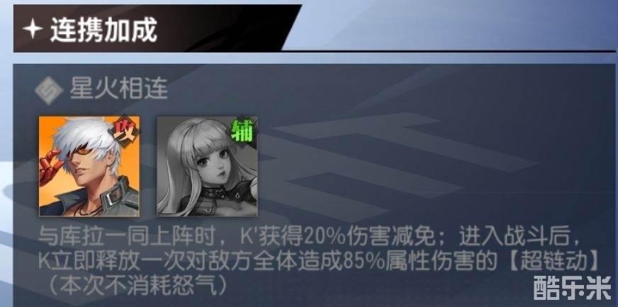 首先K和库拉可以组成连携,使K第一回合无需怒气便可释放怒气技,对敌方全体造成不可小觑的伤害