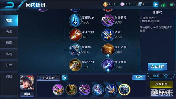 六神装推荐:巡守利斧+影忍之足+暗影战斧+冰痕之握+破军+破甲弓