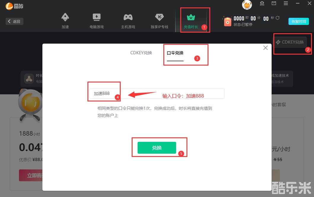 打开雷神加速器客户端--时长独享--CDKEY兑换--口令兑换--输入口令“加速888”--点击兑换