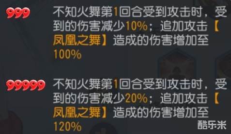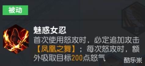 而五星的话,可以说是不知火舞输出能力提升的又一个节点,必定释放凤凰之舞就是说每次怒攻后会追加一次全体属性攻击,再加上额外吸取目标怒气的效果,火舞的怒气技能释放频率会非常的高。所以这里建议有条件想玩妹妹队的朋友可以优先把火舞先升到五星,确保队伍的输出能力先。