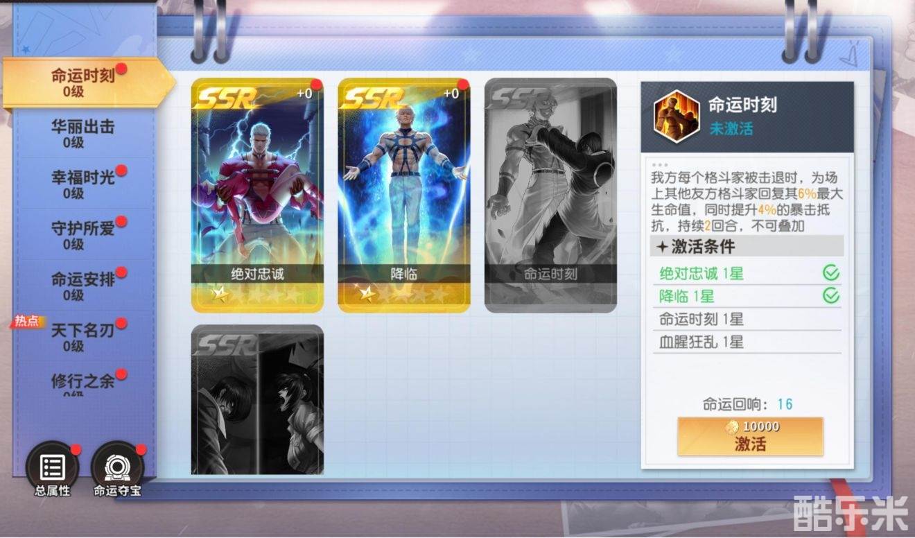 通过收集斗魂,然后使用特定的斗魂组合解锁共鸣条目,进而提升全局属性,让格斗家们战力提升,在达到一定的共鸣度后还能激活共鸣技能,让战力进一步飞跃。
