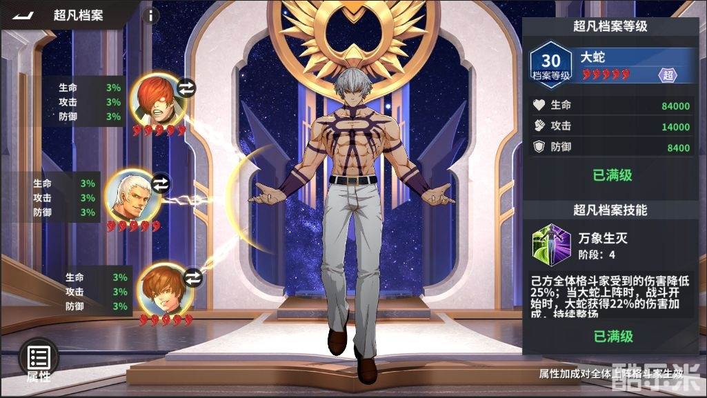 解锁超凡格斗家链接位,选择任意格斗家链接,链接的格斗家星级越高,可获得属性就越高,并且链接一定数量一定星级的格斗家后,还可提升超凡格斗家的超凡档案技能。