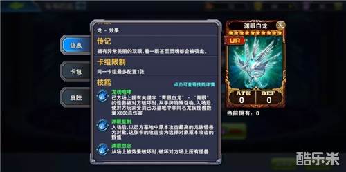 在最新剧场版登入过得怪物卡,决斗之城在某一次充值活动作为最终奖励(记得没错应该是)这次在远古遗迹中登场,下面看看效果,自己场上有青眼白龙被破坏的时候就可以特殊召唤这货了并且给予对面墓地非同名龙族怪物乘以600的伤害,真的是强到爆炸,本身的攻守为0入场后选择墓地攻击最高的龙族作为自己的攻守基本默认为白龙了吧?最后还有个更恶心的技能被效果破坏时候会破坏对面场上所有怪物!这个卡说实话跟bug一样,召唤条件还特别简单。。。能换到就别犹豫带上吧能把你的卡组强度提升一个档次!