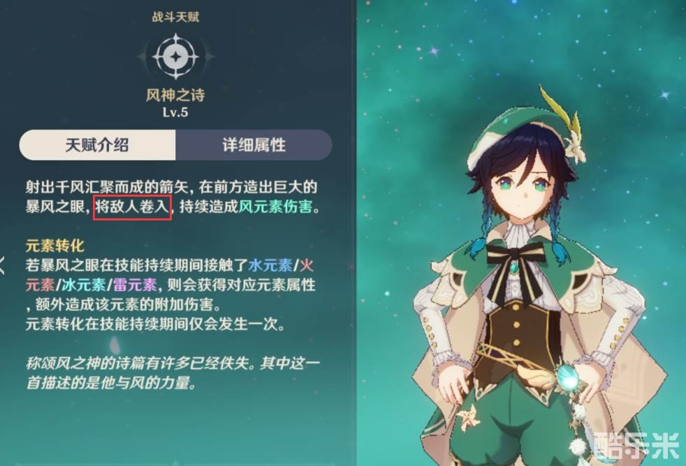 战技:在游戏中温迪的元素战技使用手中的风琴,召唤一阵聚风,将敌人吹起,从而使其无法发动【战技】,若敌人在降落之后还不知道躲藏,则会再次被卷起,这一次将会无法替换其他角色出战。