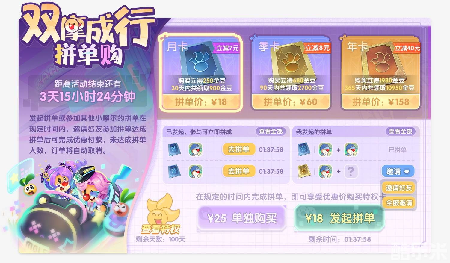活动期间,成功拼单购买超拉月卡、季卡、年卡,即可分别享受立减7元、8元、40元的折扣优惠。