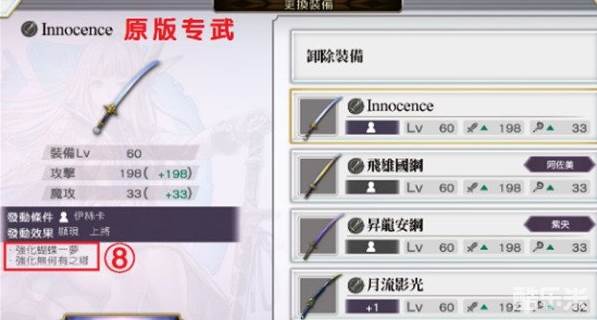 梦见角的专武获取方式叫做“显现”,即武器的潜能显现出来了。下图为原版伊丝卡的专武Innocence,装备后能提升技能“蝴蝶一梦”和“无何有之乡”的效果并减少MP消耗。AS和原版的专武是分开的。
