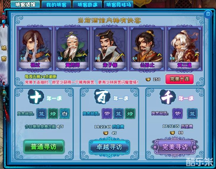 普通寻访单次抽取需要12元宝,每天拥有五次免费次数,需要20分钟冷却,可能出现白、绿、蓝三种品质侠客;卓越寻访单次抽取需要45元宝,每隔24小时免费抽取一次,可能出现紫、蓝、绿三种品质侠客;完美寻访单次抽取需要99元宝,每48小时免费抽取一次,可能出现紫色与蓝色品质侠客。玩家也可直接通过抽取完美十连,至少获得一个紫色稀有侠客。