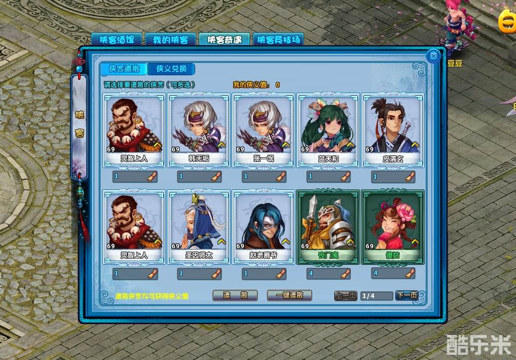 通过寻访获得到的白色、绿色侠客玩家如若不太满意,便可以通过侠客遣散的方式将其遣散。遣散后根据侠客自身颜色的不同,会得到一定量的侠义值。当侠义值积攒到一定数量后可以直接兑换侠客技能·铜或紫色侠客信物箱(紫色侠客信物箱开启后可随机获得一个紫色侠客信物,直接使用即可100%寻访到对应的紫色侠客)。