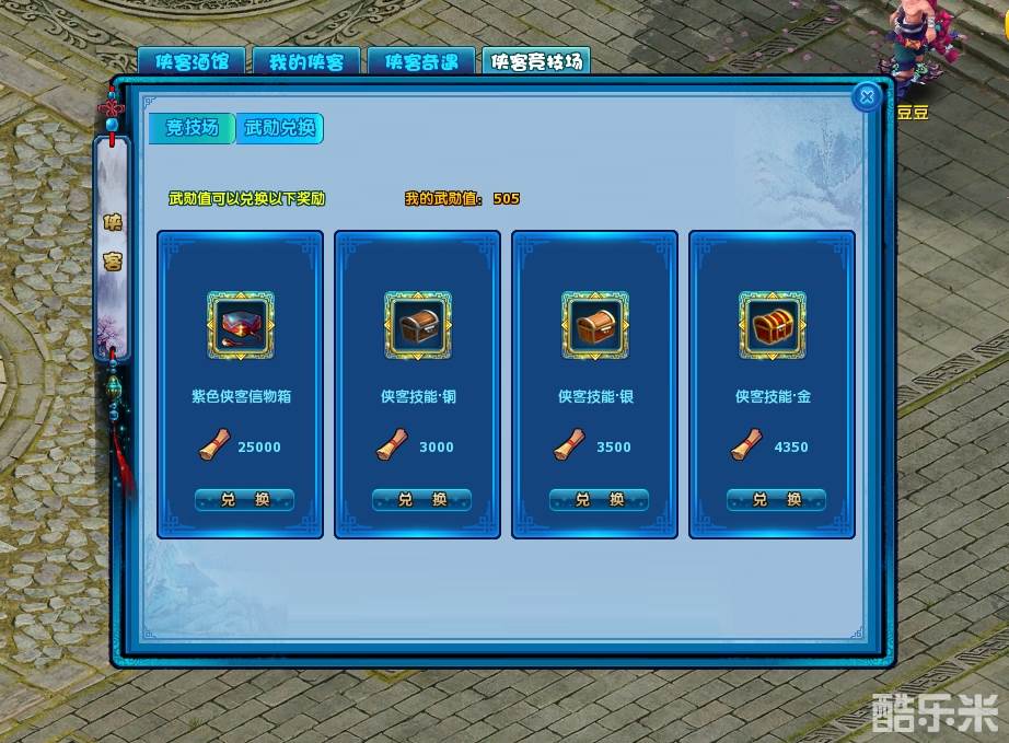 提升战力不去试试怎么能行。侠客竞技场不仅能够让你快速了解大神的侠客搭配思路,参与战斗有丰厚经验以及十战礼包可以领取之外,更重要的是不同排名每隔一定时间将获得不同的武勋奖励,而武勋奖励累积到一定数额更是可以直接兑换紫色侠客信物箱以及侠客技能·金、侠客技能·银这类有概率获得高级侠客技能书的宝箱。