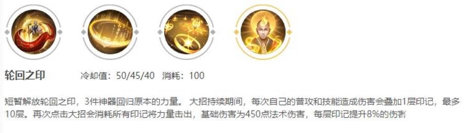 短暂解放轮回之印,3件神器回归原本的力量。 大招持续期间,每次自己的普攻和技能造成伤害会叠加1层印记,最多10层。再次点击大招会消耗所有印记将力量击出,基础伤害为450点法术伤害,每层印记提升8%的伤害