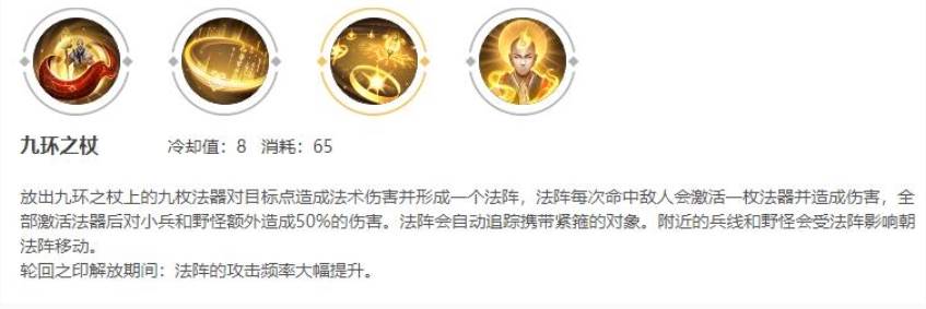 放出九环之杖上的九枚法器对目标点造成法术伤害并形成一个法阵,法阵每次命中敌人会激活一枚法器并造成伤害,全部激活法器后对小兵和野怪额外造成50%的伤害。法阵会自动追踪携带紧箍的对象。附近的兵线和野怪会受法阵影响朝法阵移动。