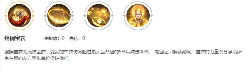 锦襕宝衣会庇佑金蝉,受到的单次伤害超过最大生命值的5%后减伤40%; 轮回之印解放期间:宝衣的力量会分享给所有在场的友方英雄单位保护他们