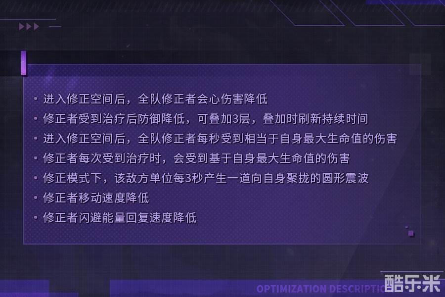 这部分词条在提高了战斗难度的同时,也将赋予管理员额外的战斗增益。管理员可以通过选择合适的修正者搭配合理的战斗策略来达成词条要求并获得相应的增益。