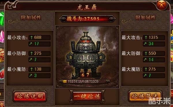 游戏过程中玩家可以将游戏中打到的装备放入龙王鼎中熔炼,每熔炼掉一件装备,龙王鼎就会获得相应的经验值,经验值达到对应的数值后龙王鼎会进行升级。龙王鼎的等级越高,给与玩家的属性增益越高。