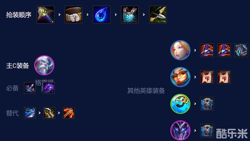 阵容必备装备:扎克圣盾,泽丽基克,男枪夜刃,萨勒芬妮高法强,必要时可以补鬼书让队友打减疗。