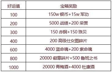 【活动内容】活动期间,每消费1000金币,即可获得100好运值,累计获得好运值可开启奖励宝箱。