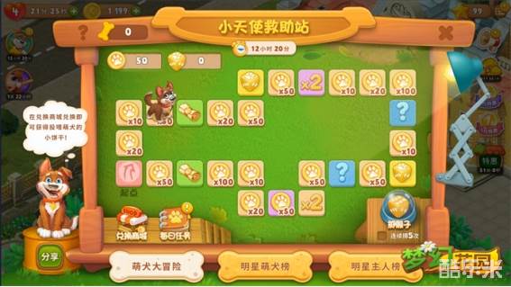 活动期间,玩家闯关获得骰子,即可参与本期“小天使救助站”萌犬大富翁活动。由汪汪队代表——花园狗子在棋盘前进,凭停留位置获得不同数量的爪爪币和随机奖励。小伙伴们可消耗爪爪币在商城兑换投喂小饼干、游戏道具等丰厚奖励,还可解锁两款公益专属限定建筑——爱犬乐园、撒野阳伞。Q萌可爱的汪汪建筑正在等你,快去参与活动吧!