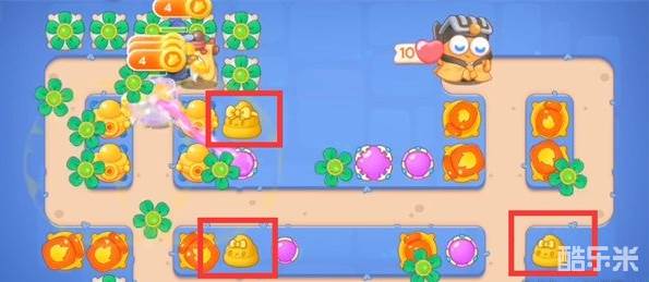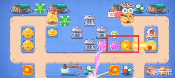 3、我们第三波在拐角位置放满级火炮瓶,魔法球,锁定钱袋依次拆除障碍物。