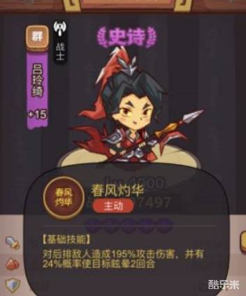 吕玲绮:定位为史诗品质的战士,最主要的技能是春风灼华,对后排敌人造成195%攻击伤害,并有24%概率使目标眩晕2回合。
