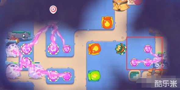 8、最后我们优先锁释放果冻的炮塔,最终炮塔摆放位置如图所示。