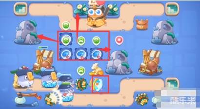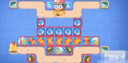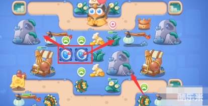 4、前方继续放置多重箭,雪球减速,后方是雷达开图,空出的位置建立一排塔防,什么塔防都可以。