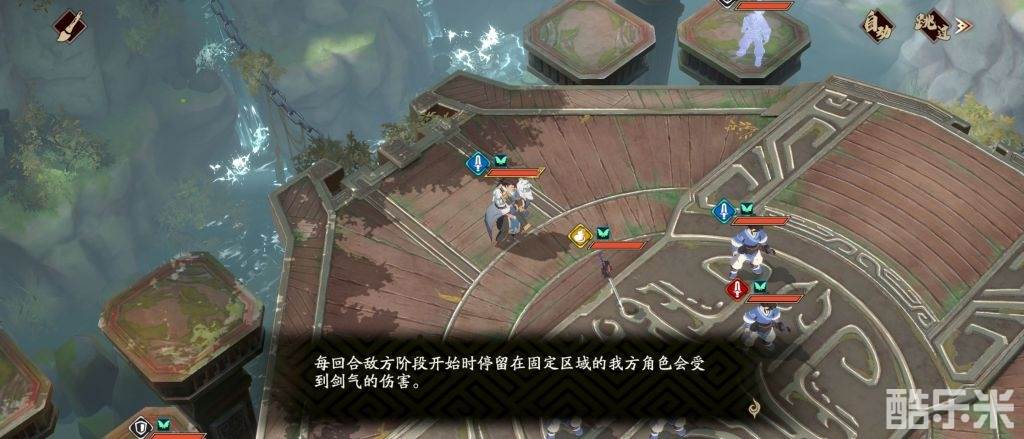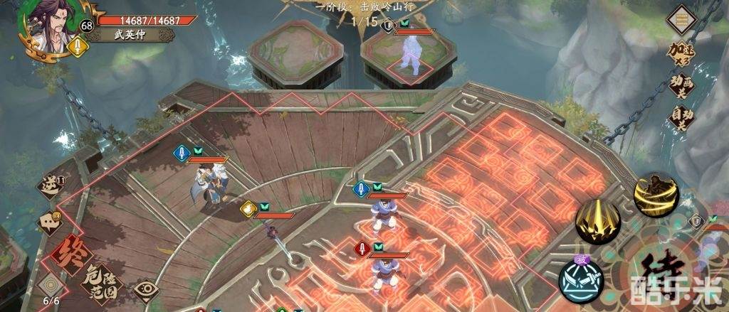 如上图所示,地图四个地方的小平台上都有一个亡魂,这次亡魂可是7点血量,但是吃技能则会掉两点。分别为右上暗剑,右下火剑,左上冰剑,左下雷剑。个人建议如果练度够,安排一个御风带固伤头手去把右上暗剑亡魂清理掉即可,暗剑魂加dibuff有点扛不住,其他的话正常六星坦克随便抗,带个aoe也死的快,因为要求只是击败岭山行所以如果是练度爆表的大佬完全可以无视所有亡魂一两回合直接莽。
