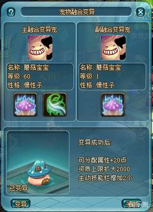 总结一下,融合变异最直观能看到的是宝宝的外观变化较大,其次就是在属性上的增强。融合变异需要准备2只同种类的宝宝,且主融合宝宝需要达到60级和双特性,影响融合成功率的主要因素是宝宝的性格与是否处在进化形态,若是都不满足,则很多概率是融合失败的,所以至少需要满足性格相同这个条件。