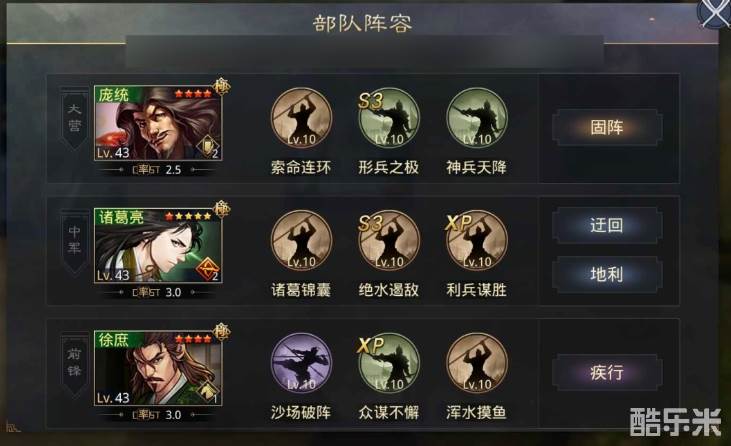 大营武将庞统,全谋略加点,战法【形兵之极】【神兵天降】,工具人主要提供buff,和分摊队伍伤害输出。