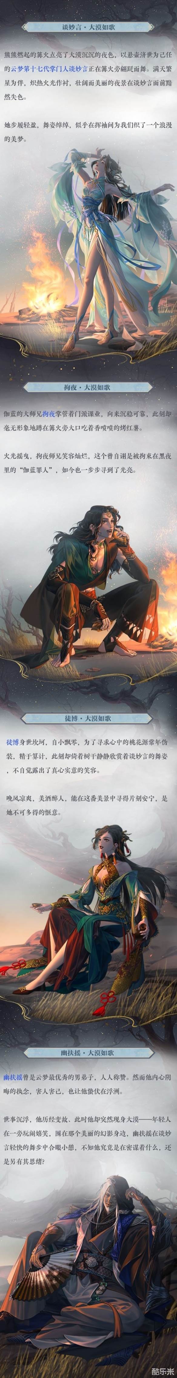 大漠篝火旁,谈妙言随性起舞,幽扶摇偷偷小憩,还有徒博与拘夜陪你一起共赏夜景!集齐四位名士的大漠画卷后,还能解锁限定背景图哦。