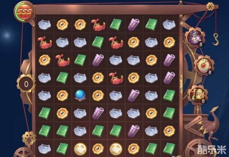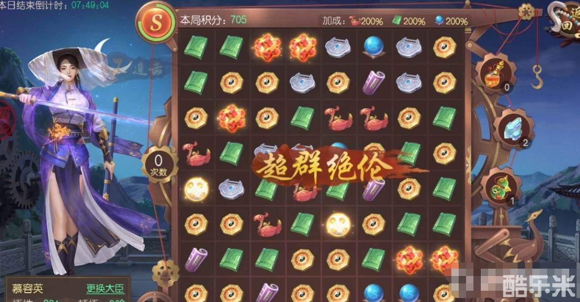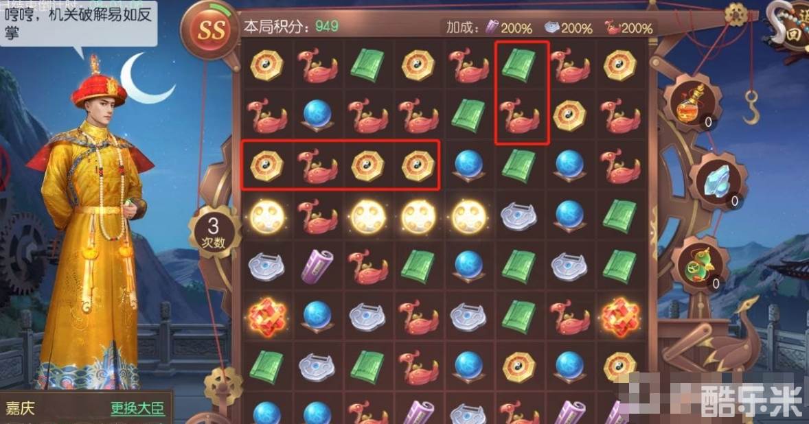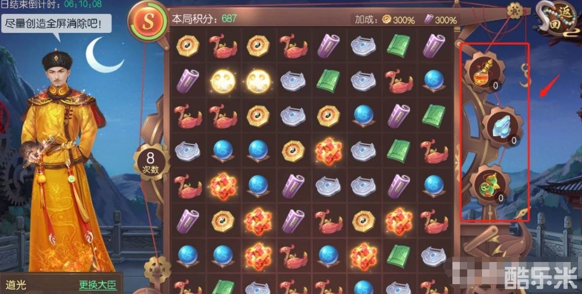 1、想要参加千机迷云,君王等级必须≥明君三级,进入机关阵后,派遣一位得力大臣进行机关迷阵的破解。机关阵由各种元素组成,可以通过上下或左右交换消除元素获得积分,步数为15步。
