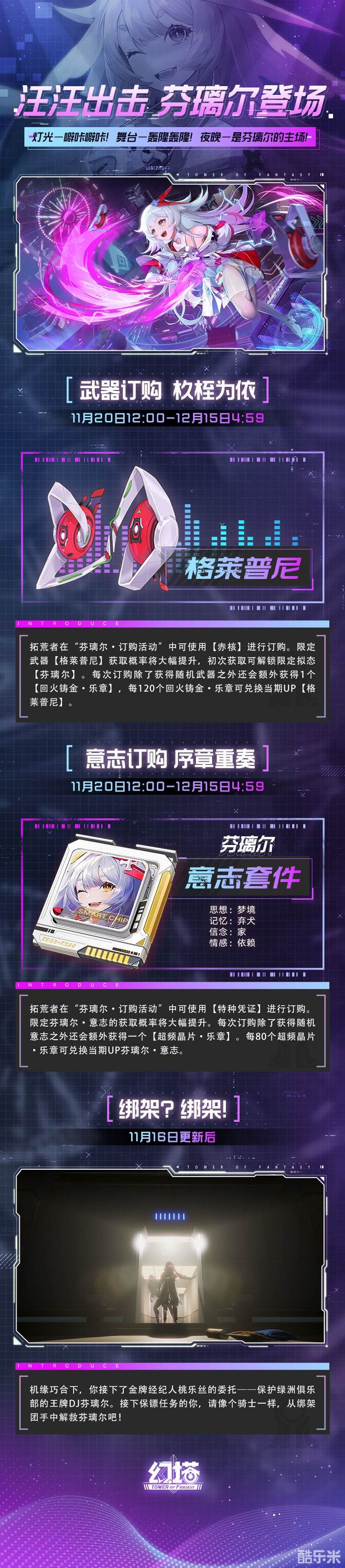 11月16日更新后,拟态专属剧情解锁,拓荒者,解救芬璃尔的大任就交给你啦!11月20日12:00,镜都偶像芬璃尔正式登场,序章重奏,欢快的乐章准时响起。