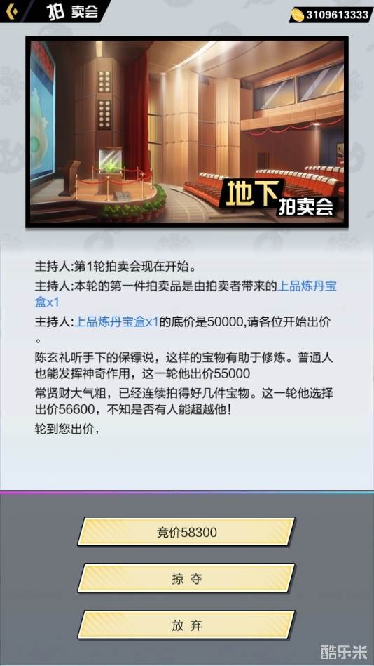 地下地下拍卖会是修真者跟系统的NPC进行叫价争夺物品,可在几番叫价之后选择跟价或者放弃,如果修真者觉得自己实力可行,可以选择出手抢夺强行获得心动的拍卖物。