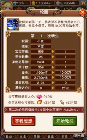 轮回转世前尽可能收集多的勇者灵石,转生之后灵石转换成勇者之心,即可给予勇者提供百分比的攻击力加成,勇者之心另一个功用就是升级徽章。记得佩戴蓝色宝石,配上灵石增益BUFF,最好再找个长翅膀带灵石的小猴子,可以最大化程度获得勇者灵石,为下次的转世轮回做准备。