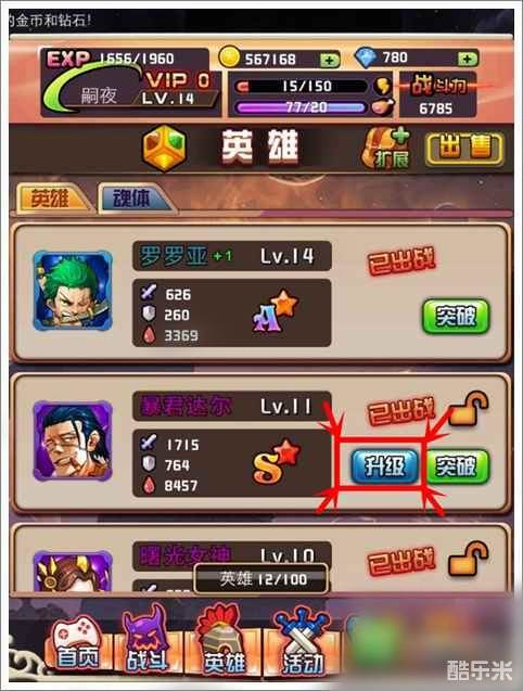 然后我们可以选择我们想要升级的英雄,点击该英雄旁边的“升级”按钮。
